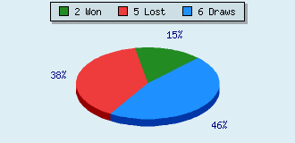 0 games running 13 games finished 2 games won: 0 by mate 1 by resign 1 by timeout 5 games lost: 0 by mate 5 by resign 0 by timeout (= 0% ZÜ-Quote) 6 games drawn