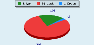 0 games running 43 games finished 8 games won: 1 by mate 5 by resign 2 by timeout 34 games lost: 0 by mate 33 by resign 1 by timeout (= 2.3% ZÜ-Quote) 1 games drawn