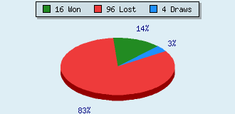 0 games running 116 games finished 16 games won: 0 by mate 11 by resign 5 by timeout 96 games lost: 10 by mate 86 by resign 0 by timeout (= 0% ZÜ-Quote) 4 games drawn