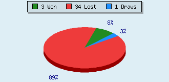 0 games running 38 games finished 3 games won: 0 by mate 3 by resign 0 by timeout 34 games lost: 0 by mate 0 by resign 34 by timeout (= 89.5% ZÜ-Quote) 1 games drawn