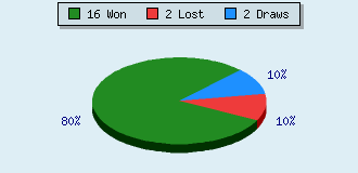 0 games running 20 games finished 16 games won: 2 by mate 12 by resign 2 by timeout 2 games lost: 0 by mate 2 by resign 0 by timeout (= 0% ZÜ-Quote) 2 games drawn
