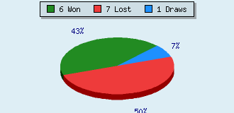 0 games running 14 games finished 6 games won: 0 by mate 6 by resign 0 by timeout 7 games lost: 0 by mate 7 by resign 0 by timeout (= 0% ZÜ-Quote) 1 games drawn